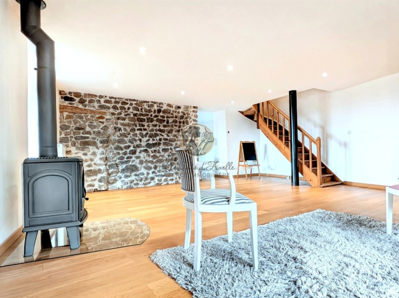 Au rez-de-chaussée, vous découvrirez un vaste espace de vie baigné de lumière, composé d’un salon-salle à manger chaleureux, agrémenté d’un poêle contemporain et d’un superbe mur en pierre, en harmonie avec le cachet de la bâtisse. La grande cuisine moderne, entièrement équipée, donne directement accès à une terrasse extérieure. Une entrée fonctionnelle avec lavabo, une buanderie intégrée, des WC et un espace polyvalent (bureau ou coin lecture) complètent ce niveau.